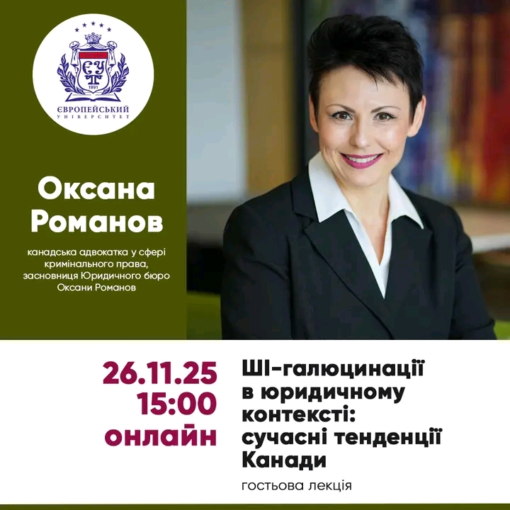 🎓 Гостьова лекція канадської юристки Оксани Романов у Європейському університеті 26 листопада 2025 року о 15:00 відбудеться гостьова лекція для студентів та наукової спільноти Європейського університету на тему: «ШІ-галюцинації в юридичному контексті: сучасні тенденції Канади» Запрошена спікерка — Оксана Романов, канадська адвокатка у сфері кримінального права та засновниця Юридичного бюро Оксани Романов. …
