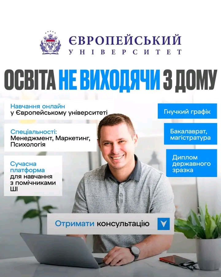 В Європейському університеті ви можете навчатися повністю онлайн, поєднуючи навчання з роботою, сім’єю та власним ритмом життя. 🔹Можливо ддя спеціальностей: Менеджмент, Маркетинг, Психологія 🔹Гнучкий графік 🔹Сучасна платформа з ШІ-помічниками Програми доступні на рівнях бакалаврату та магістратури. А після завершення навчання студенти отримують диплом державного зразка, що визнається в Україні та за кордоном. …