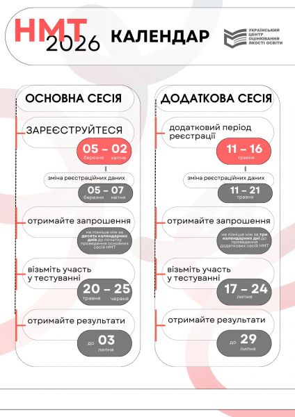 Наказом Міністерство освіти і науки України затверджено Календарний план організації та проведення національного мультипредметного тесту (НМТ) у 2026 році. Європейський університет рекомендує майбутнім вступникам заздалегідь зафіксувати ключові етапи НМТ у власному календарі. Дати проведення НМТ-2026 Основні сесії: 20 травня – 25 червня Додаткові сесії: 17–24 липня Реєстрація для участі в НМТ Реєстрація…